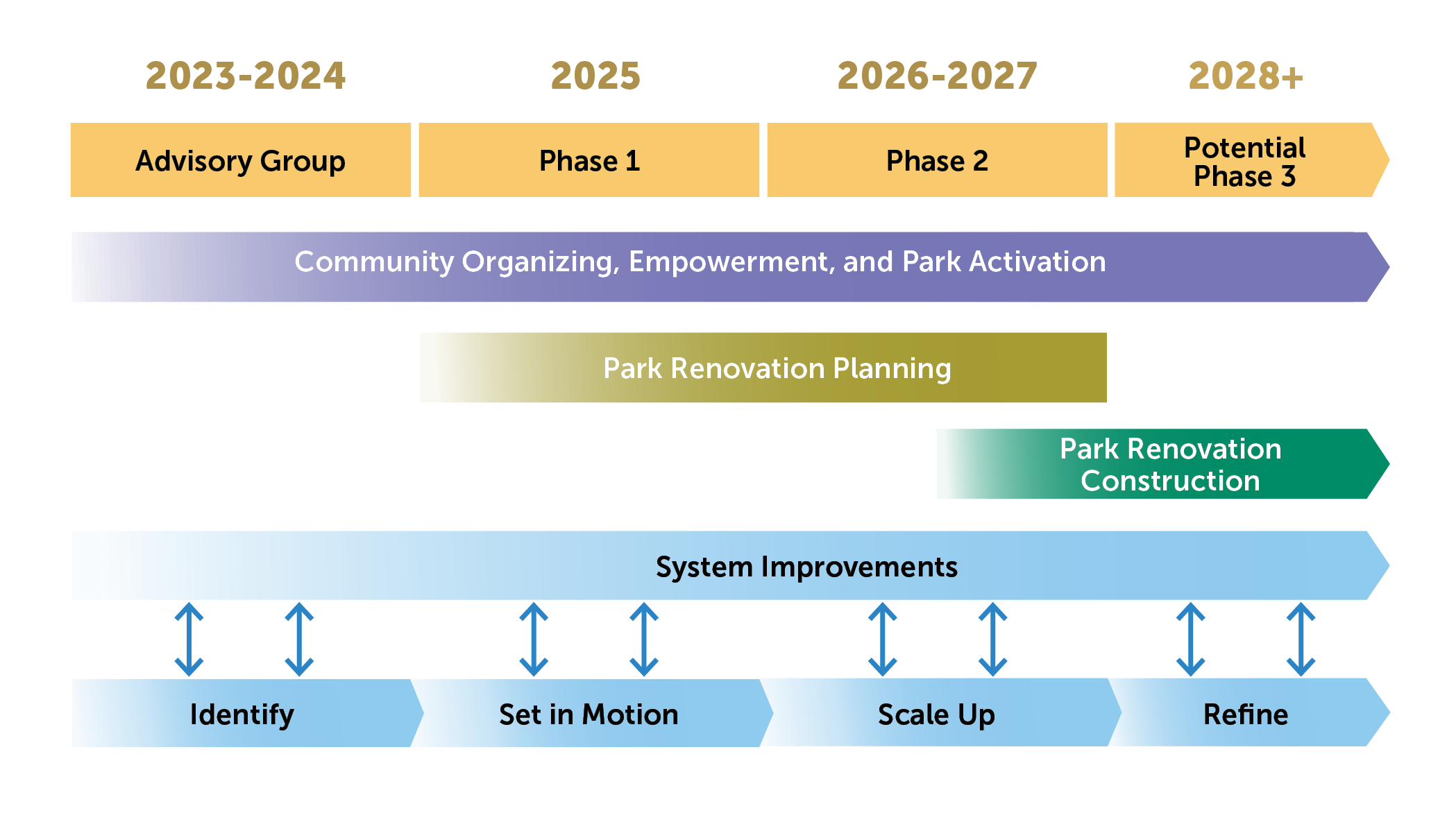 The Hellman Foundation is investing catalytic funding over two phases so far to support park equity in Richmond and the desired outcomes of renovated parks; well-maintained, well-used, well-funded parks; and community leadership. Phase 2 (2026 through 2027) of the RichPEP Collaborative will build on foundations of activation and community engagement laid in Phase 1 and expand into key areas: power-building, articulating goals for systems change, planning and implementing park renovations, and seeking the resources needed for a vibrant, equitable, and effective park system.